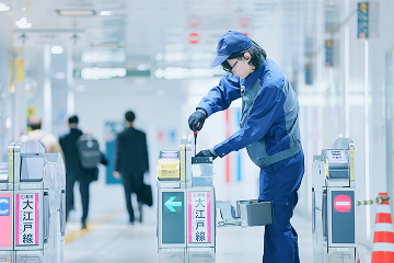 当社は、都営地下鉄駅等の自動改札機や空調機の保守管理、車両の検査など、都営交通を安全・快適にご利用いただくための事業を行っています。